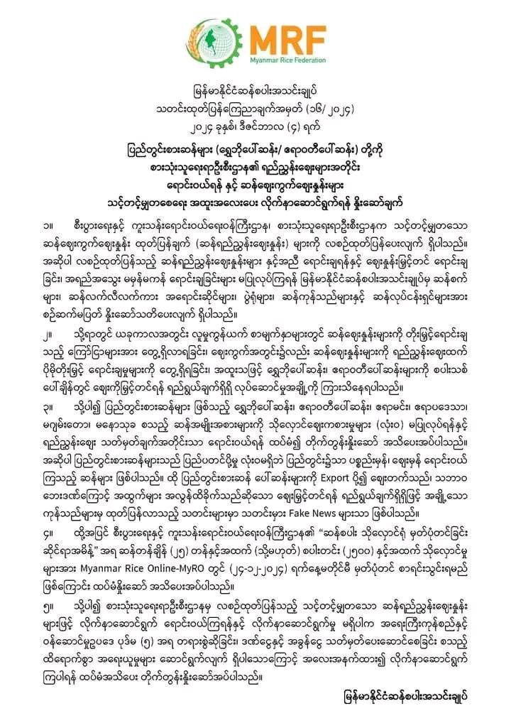缅甸稻米协会于12月4日发布通告,呼吁大米商家不要对大米进行囤积和哄抬价格。所有商家必须按照政府设定的参考价格出售大米,不得擅自提高价格。