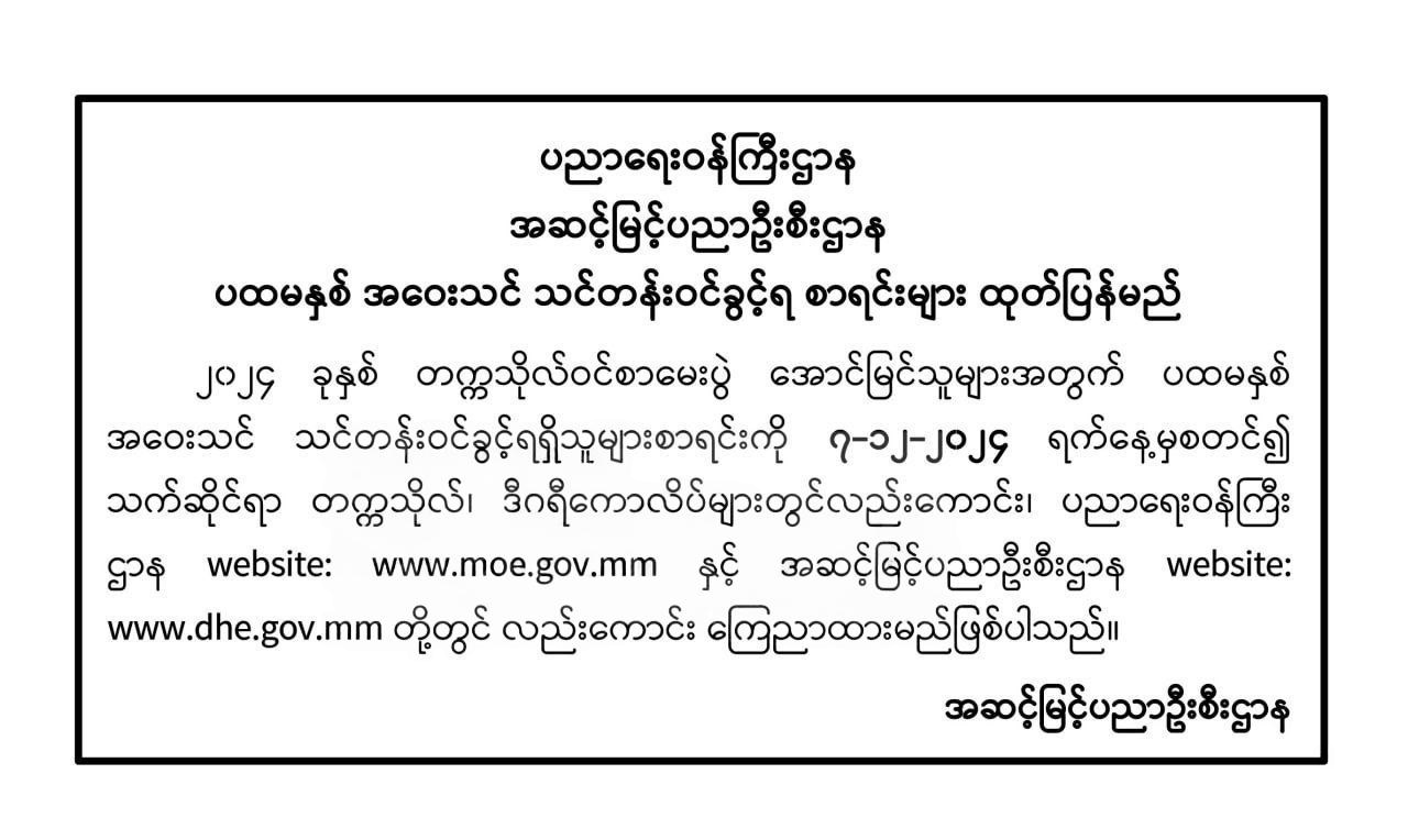 2024年大学入学考试合格学生的第一年远程教育(အဝေးသင်)录取名单将于12月7日公布。