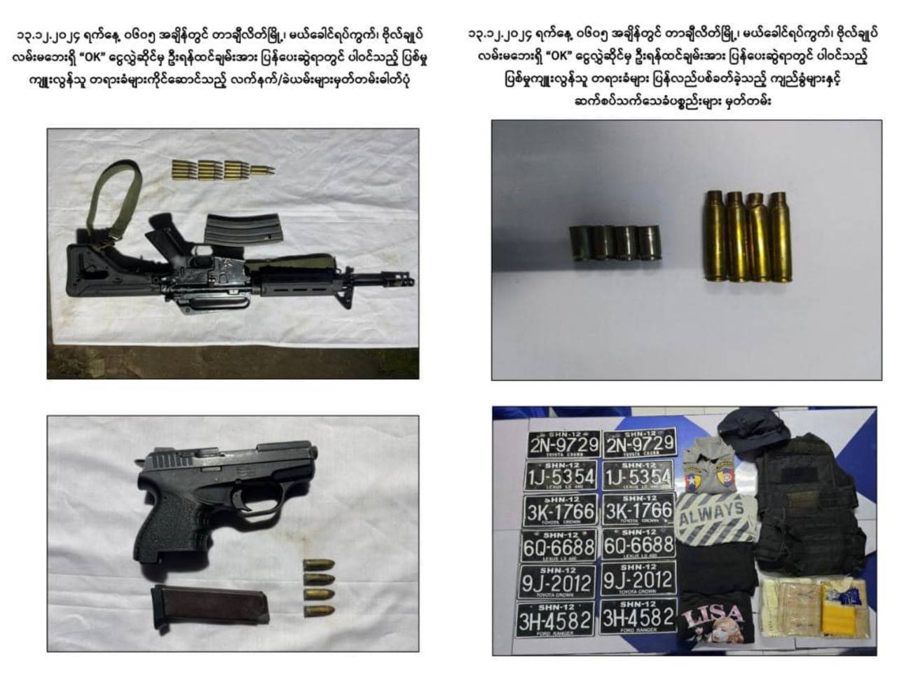 警方在行动中缴获了一把手枪、一把步枪、作案车辆、12个车牌、两件防弹衣、以及65,000片麻黄素。