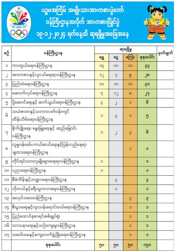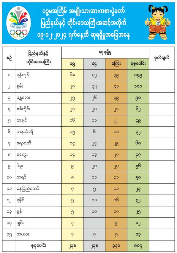 省/邦排名中 仰光仍然位居第一获得68枚金牌,其次是掸邦和曼徳勒。掸邦获得27枚,曼徳勒省获得25枚金牌。实皆省获得21枚 位居第四。