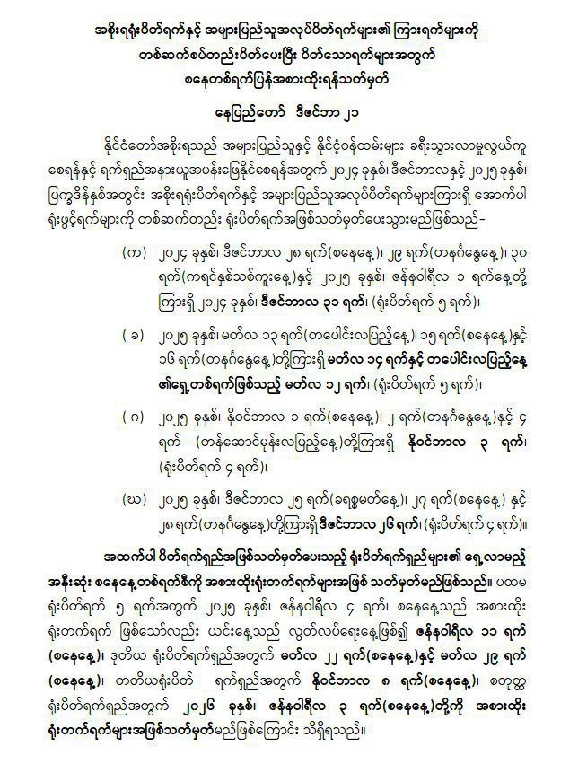12月21日,缅甸官方宣布,为了方便民众出行和休闲度假,在2024年12月和2025年,法定节假日和周末之间的工作日将放假,调整为连休,同时补班安排在下一个周六。