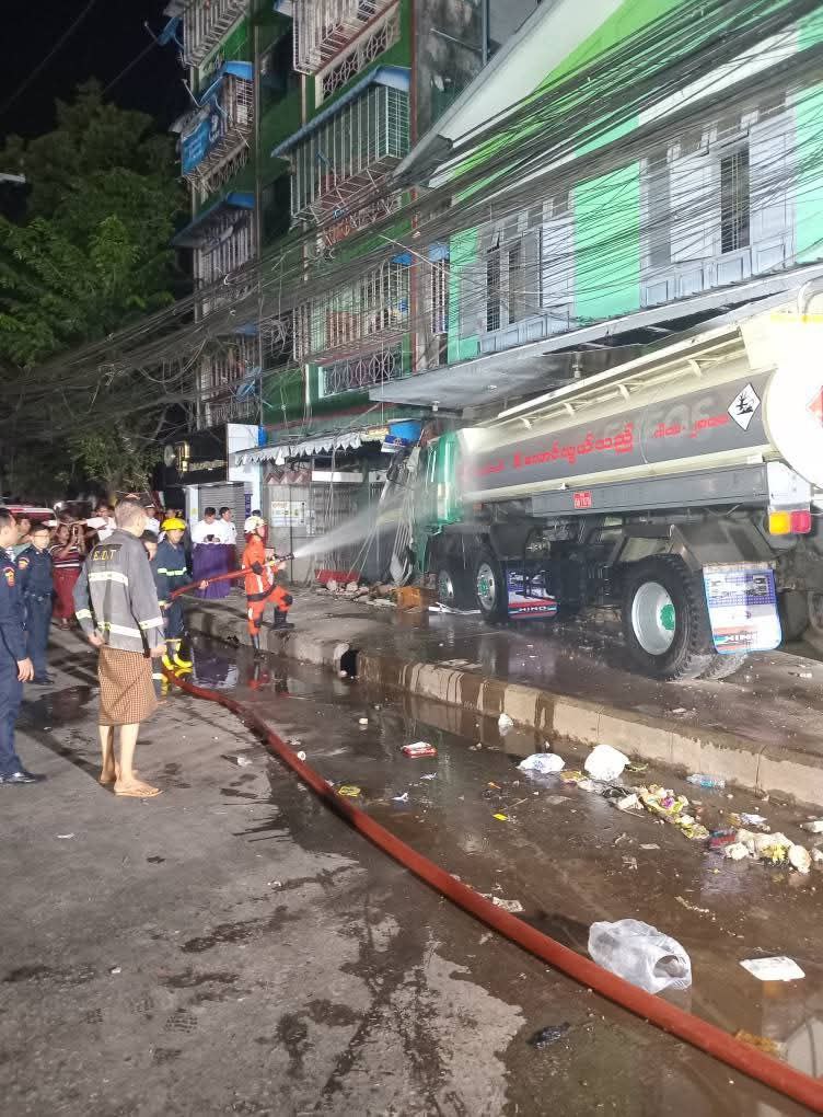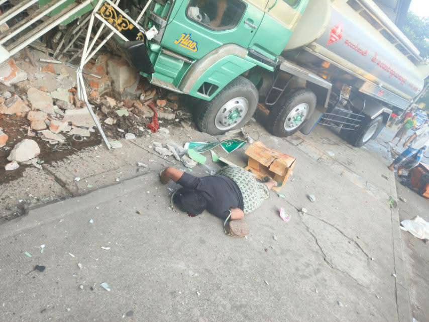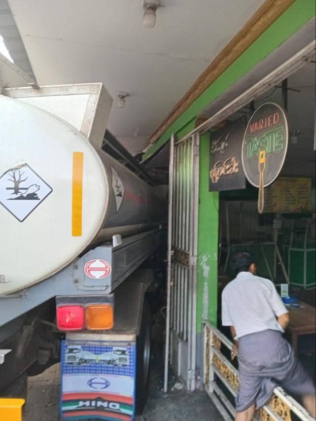 12月23日下午6点左右,在仰光市达梅(တာမွေ)镇区 纳乔(နတ်ချောင်း)街区, 发生了一起严重的交通事故。一辆油罐车因刹车失灵,冲入了 一家茶馆,撞到了旁边一栋8层楼的建筑。