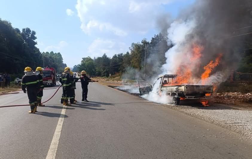 12月26日下午1点,曼德勒省 彬乌伦的绕城路(9/8)和(10)路桩之间发生了一起车辆起火事故。