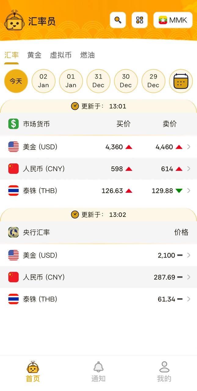 汇率员APP 每天更新缅甸国内汇率 黄金 虚拟币 燃油等价格!