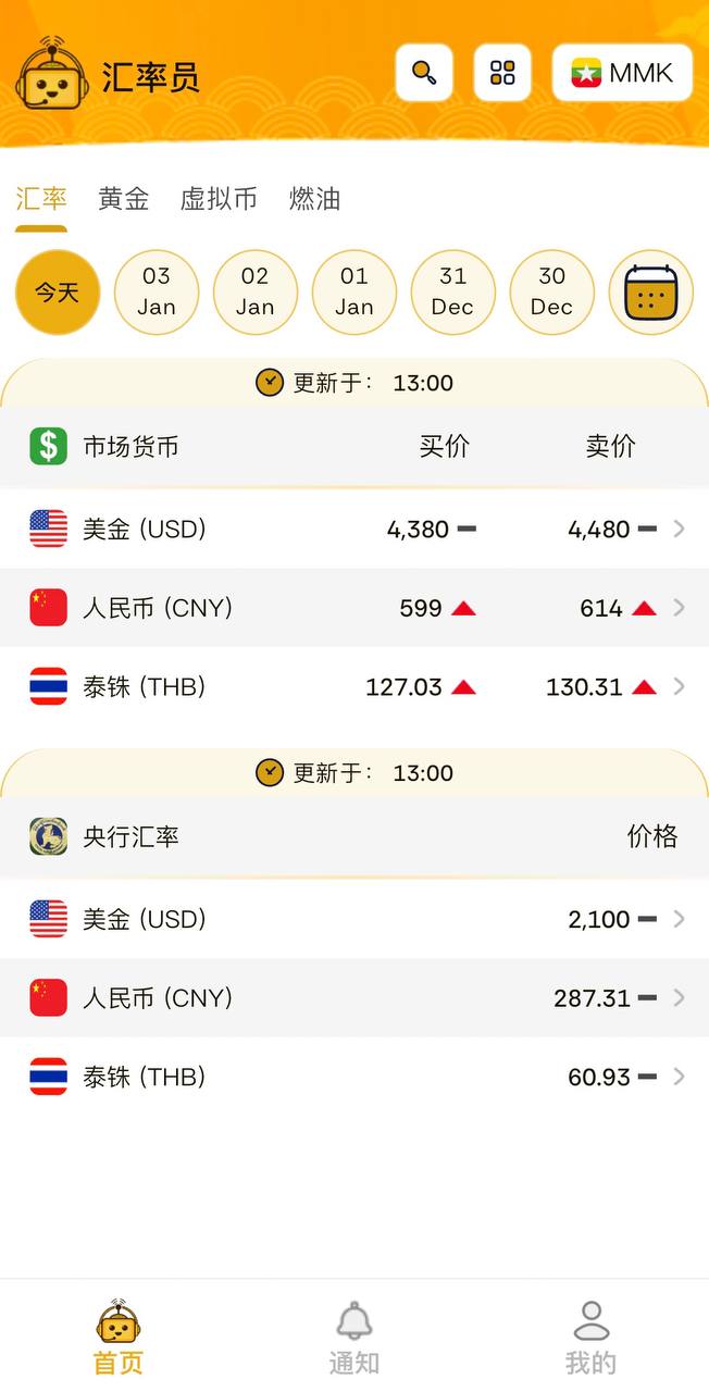 汇率员APP 每天更新缅甸国内汇率 黄金 虚拟币 燃油等价格!