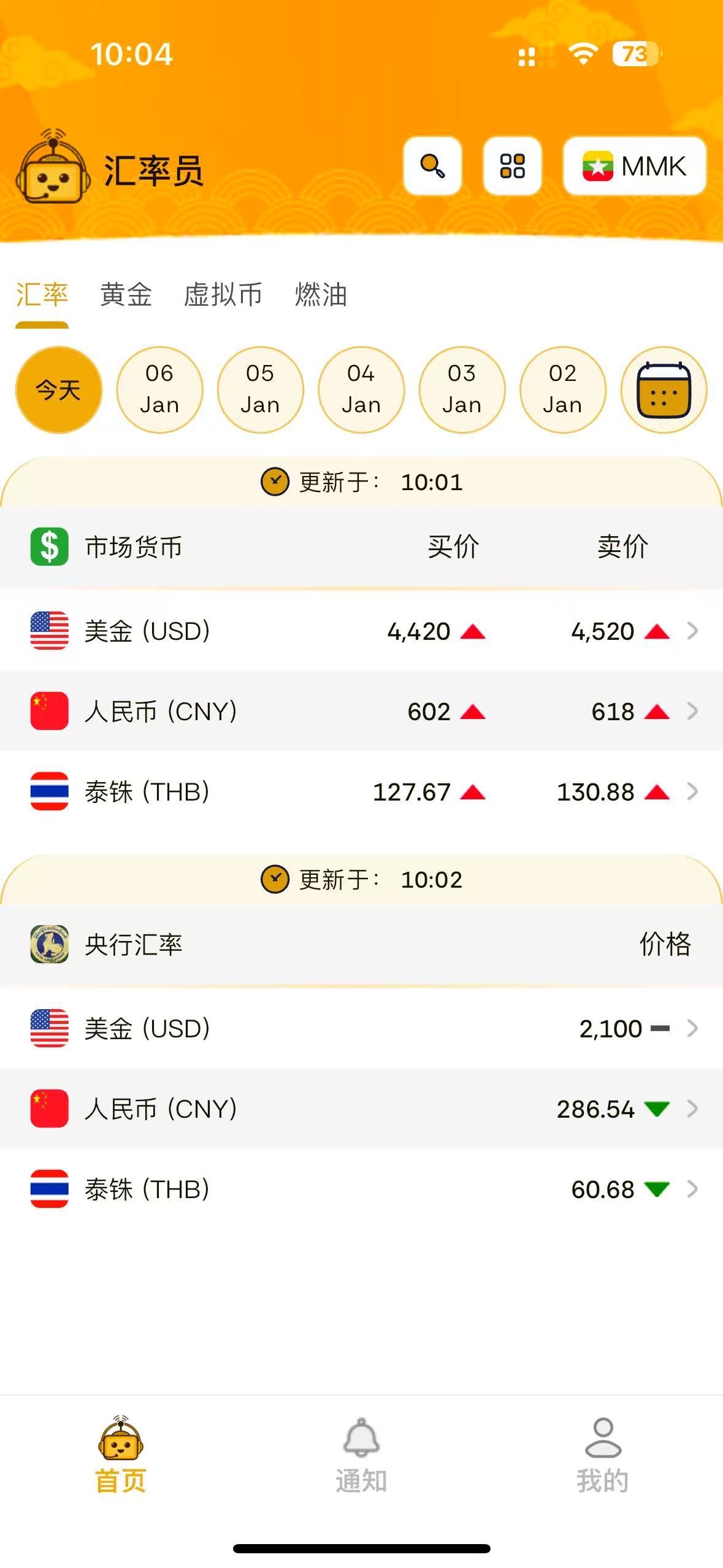 汇率员APP 每天更新缅甸国内汇率 黄金 虚拟币 燃油等价格!