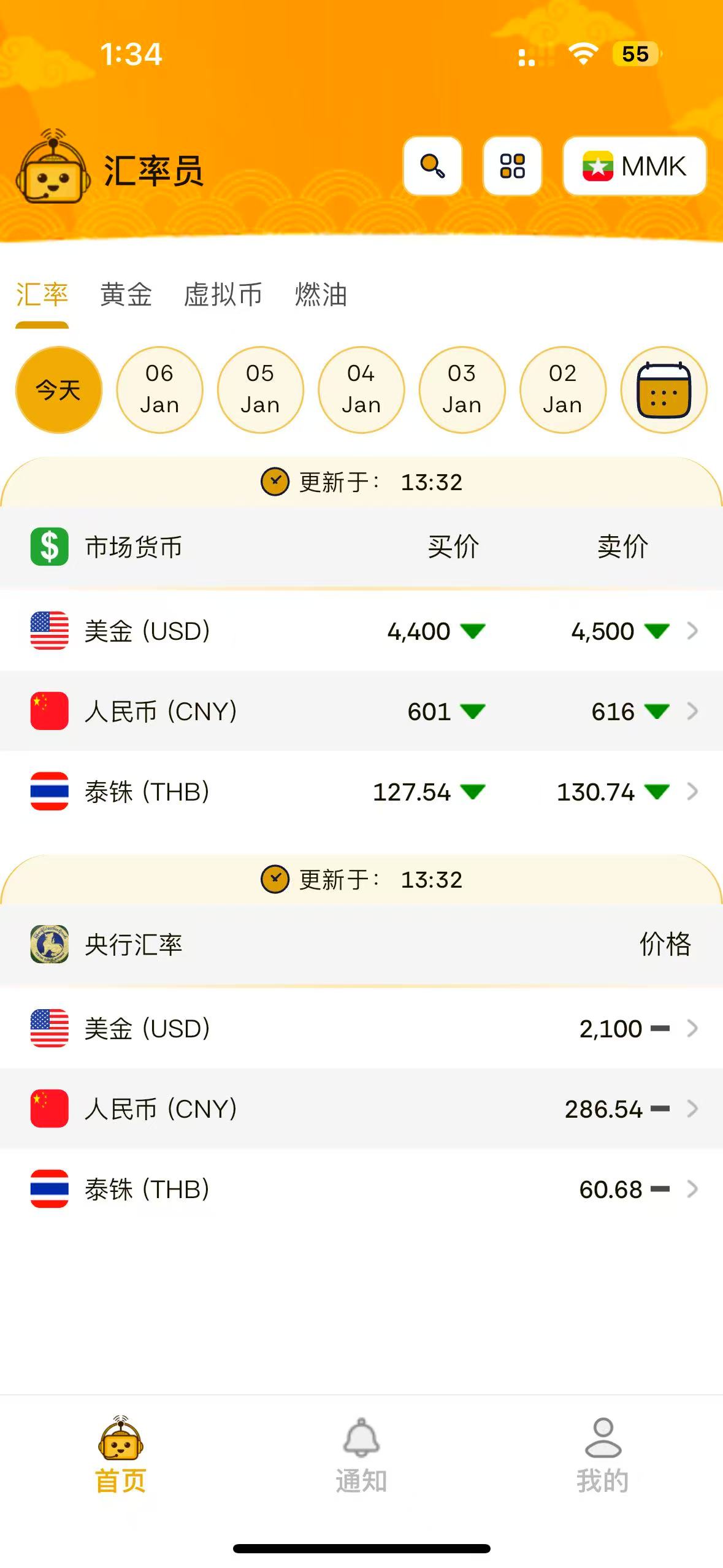 汇率员APP 每天更新缅甸国内汇率 黄金 虚拟币 燃油等价格!