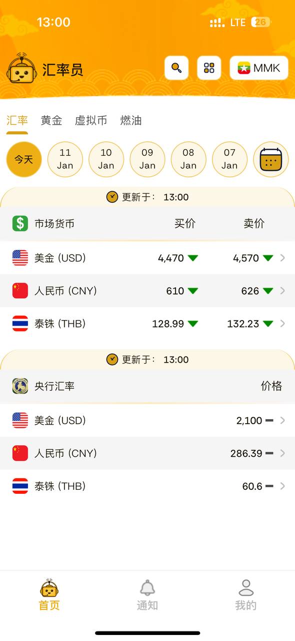 汇率员APP 每天更新缅甸国内汇率 黄金 虚拟币 燃油等价格!