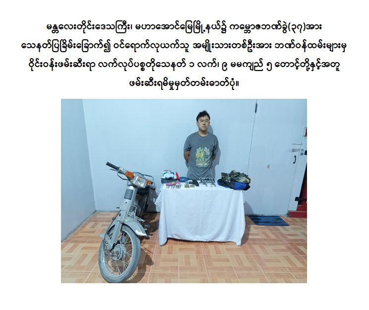 11月13日,在曼德勒省玛哈昂梅镇(မဟာအောင်မြေမြို့နယ်)的KBZ银行分行(第37分行),一名男子持自制手枪进入银行威胁工作人员意图抢劫,银行员工联手将其制服并成功抓获。