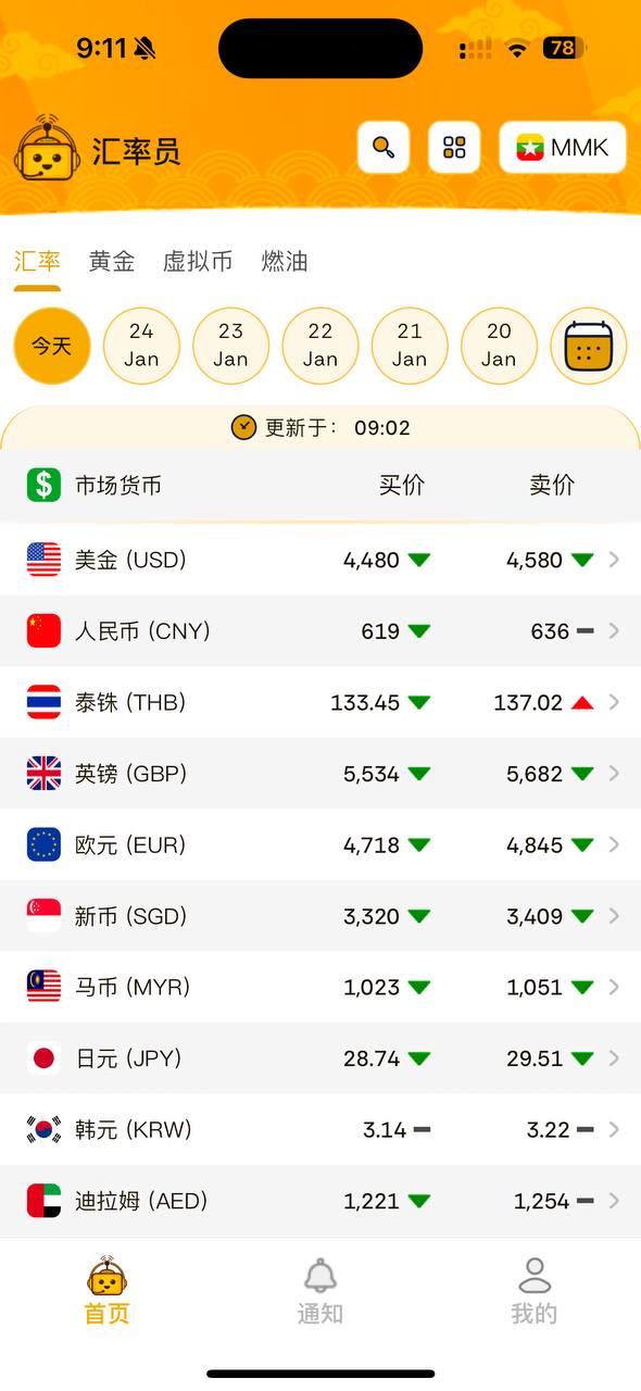 汇率员APP 每天更新缅甸国内汇率 黄金 虚拟币 燃油等价格!