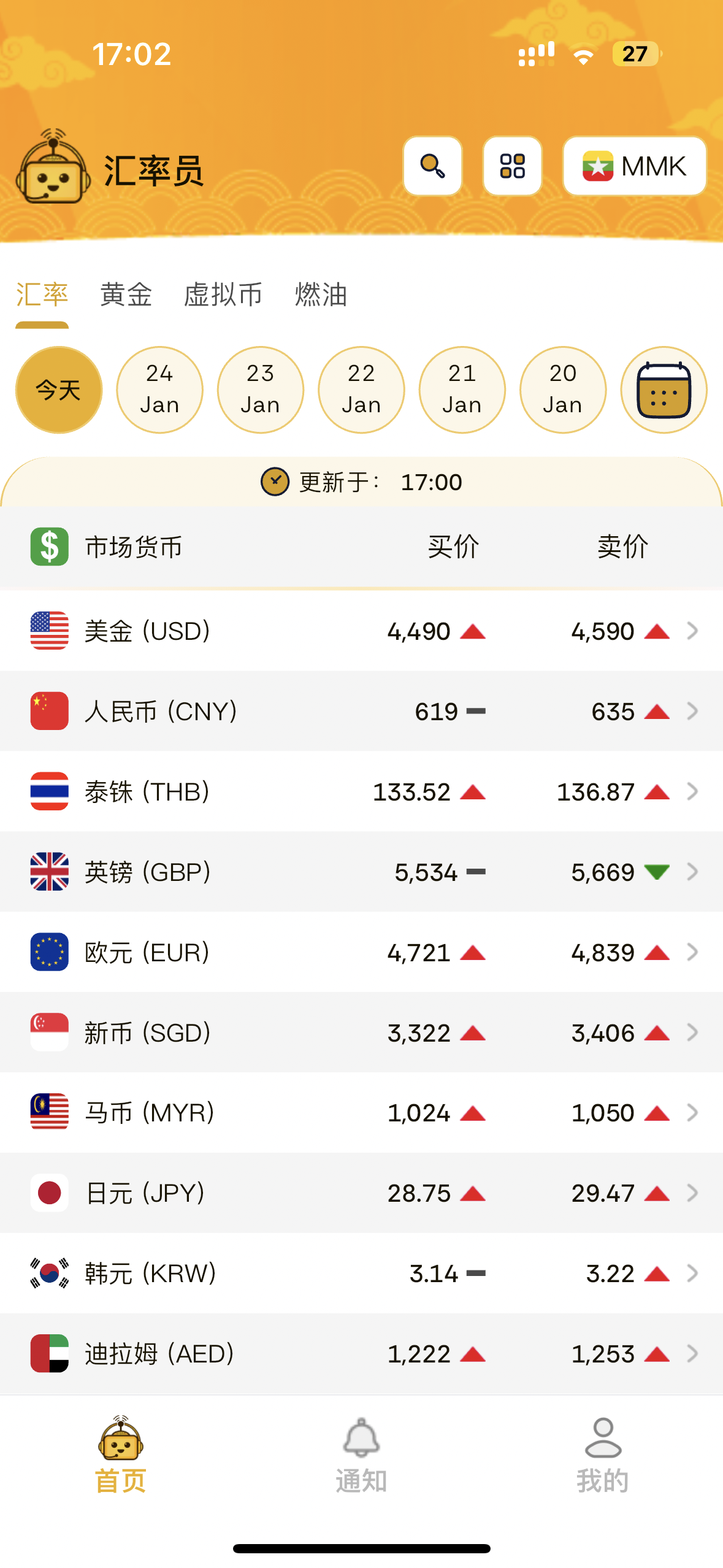 汇率员APP 每天更新缅甸国内汇率 黄金 虚拟币 燃油等价格!