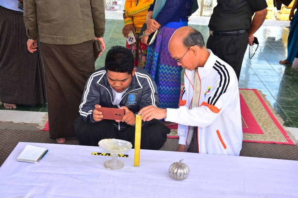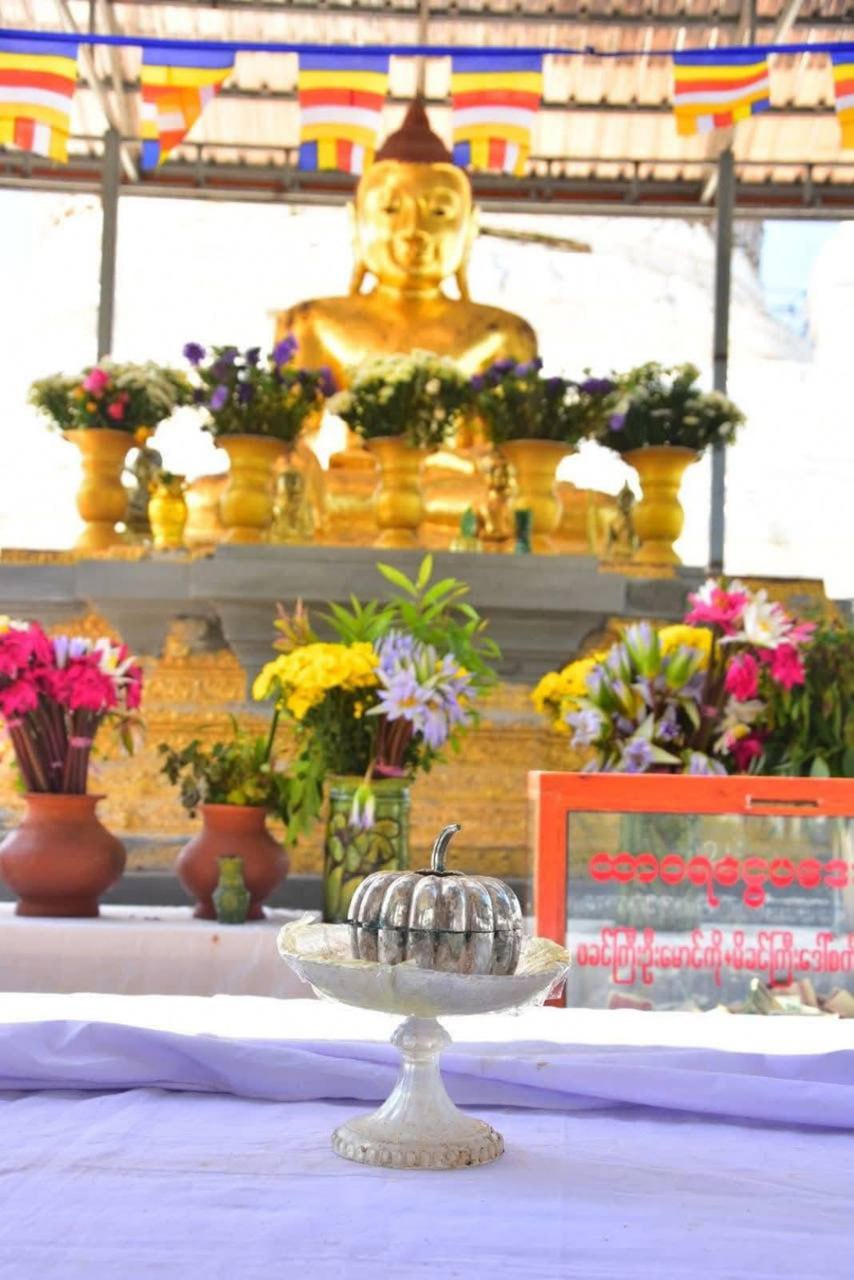 11月30日傍晚,在曼德勒山脚下、南迈邦达宫山达穆尼佛塔(နန်းမြေဘုံသာ စန္ဒာမုနိဘုရား)院内挖沟施工时,发现了一只用银做成的、南瓜造型的骨瓮。