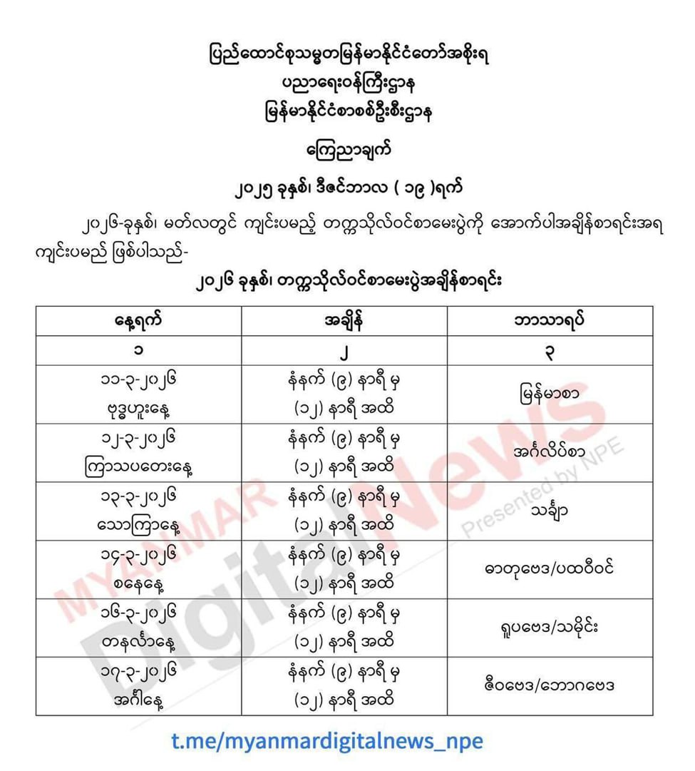 教育部下属的缅甸考试司在12月19日发布通知说,2025—2026学年高考将从2026年3月11日开始举行。