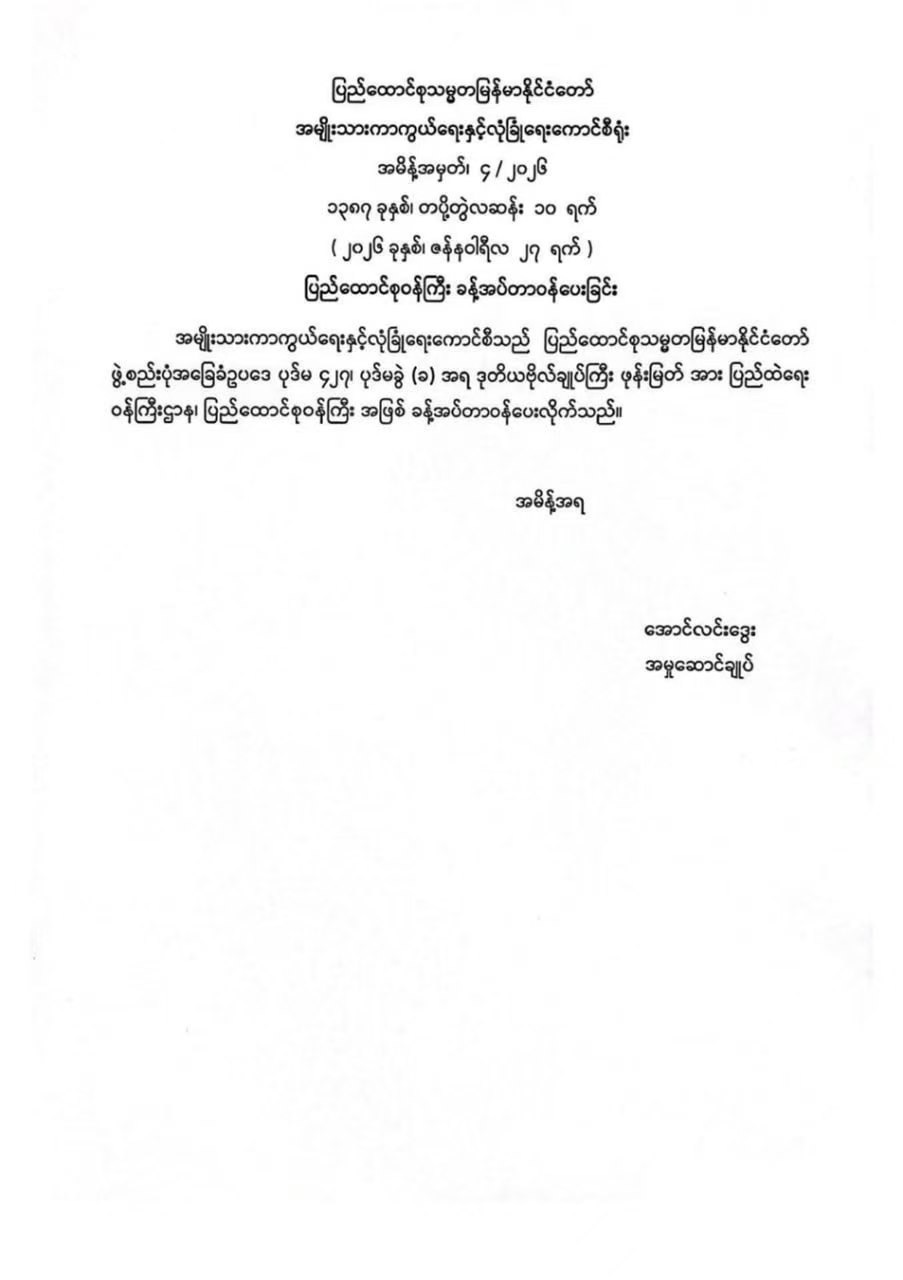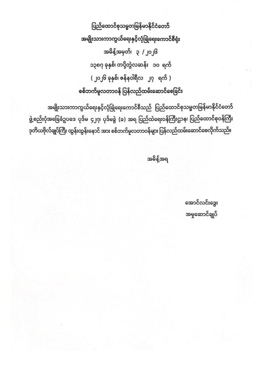 缅甸国防与安全委员会发布通告称,原内政部部长中将吞吞诺(Tun Tun Naung)被调回军队,将恢复原来的军职。根据宪法第427条规定,丰妙(Phone Myat)中将接任部长一职。这项命令在1月27日正式发布。