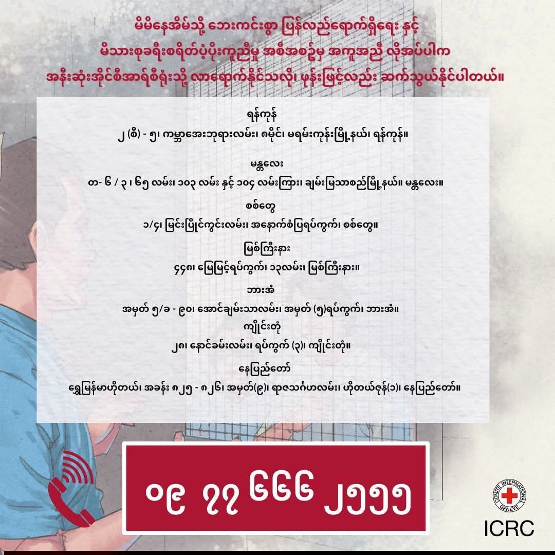 仰光省政府发布通告称,为了筹备第79届联邦节庆典,2月10日彩排当天和2月12日正式活动期间,人民广场(ပြည်သူ့ရင်ပြင်)周边的卑谬路(Pyay Road)将临时封闭。封路期间,由北向南行驶的车辆要在眉尼贡(မြေနီကုန်း)立交桥下右转改走下基敏丹路(အောက်ကြည့်မြင်တိုင်လမ်း),由南向北行驶的车辆则要转入联邦展馆路(ပြည်ထောင်စုရိပ်သာလမ်း),经格勒宾路(ခရေပင်လမ်း)和阿隆路(အလုံလမ်း)绕行。