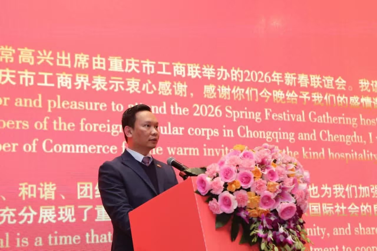 2月4日,缅甸驻重庆总领事吴觉泽雅林(U Kyaw Zeya Lin)在重庆总商会举行的2026年新春联谊会上说,得益于陆海新通道,缅甸产品现在进入中国市场变得更加容易。吴觉泽雅林表示,缅甸是中缅经济走廊的重要合作伙伴,重庆在贸易、投资和供应链合作方面也提供了很大的支持。