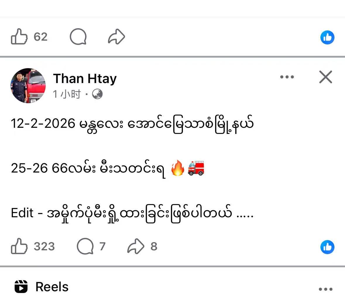 2026年2月12日,曼德勒市昂梅达散(အောင်မြေသာစံ)镇区25条街和26条街之间的66条街上发生了火灾,消防队员已经赶到现场灭火,目前具体的损失情况还不清楚。