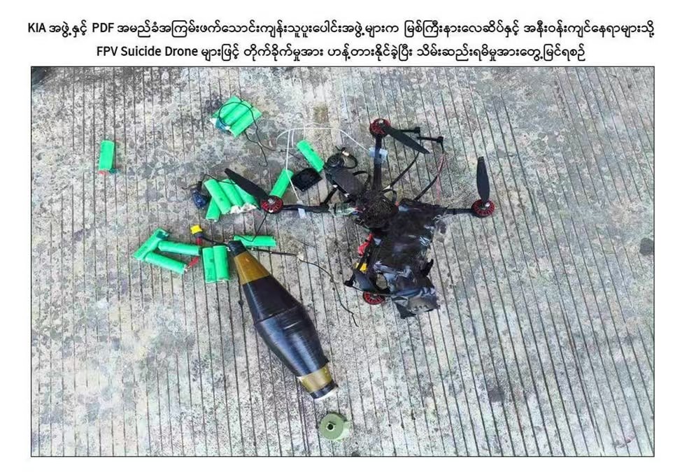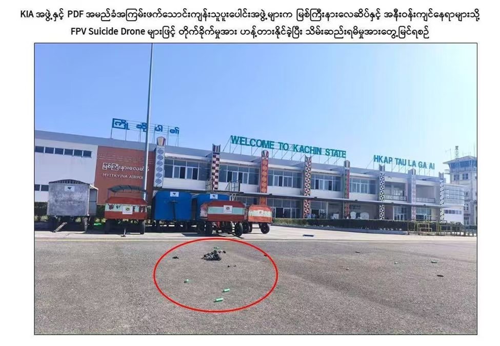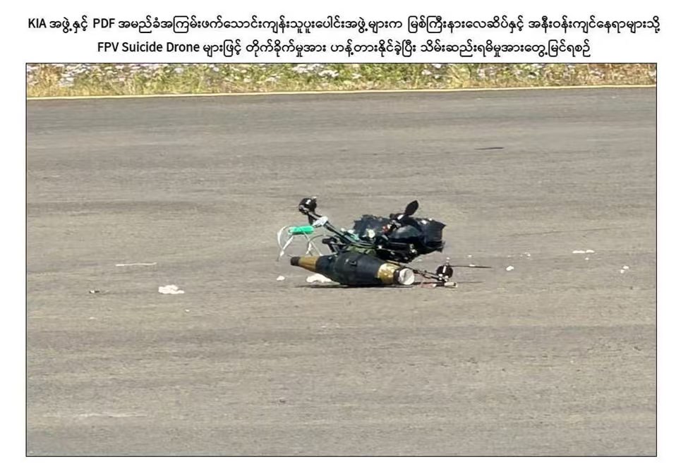 克钦邦密支那(Myitkyina)机场安保部队于2月12日早上成功化解了一次危机。当时,几架FPV自杀式无人机试图发起袭击,但很快就被机场的防空预警系统锁定。安保人员果断出手拦截,迫使无人机坠落在跑道附近的空地上。虽然无人机上挂了炸药,但都被后续赶来的排爆人员成功拆除,没有发生爆炸,现场也没有任何受伤人员,机场设施和跑道也未受损。
