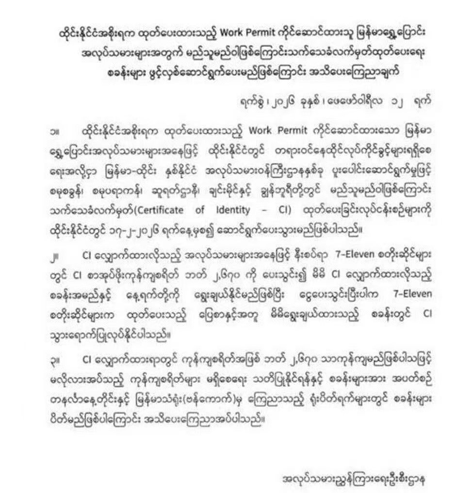 缅甸劳工局2月12日发布通知称,经过和泰国劳工部的协商,双方决定从2月17日开始,正式启动在泰缅甸劳工的身份证明(CI)办理工作。这次办理点覆盖了五个主要地区,分别是龙仔厝(Samut Sakhon)、北榄(Samut Prakan)、素叻他尼(Surat Thani)、清迈和春武里(Chon Buri)。