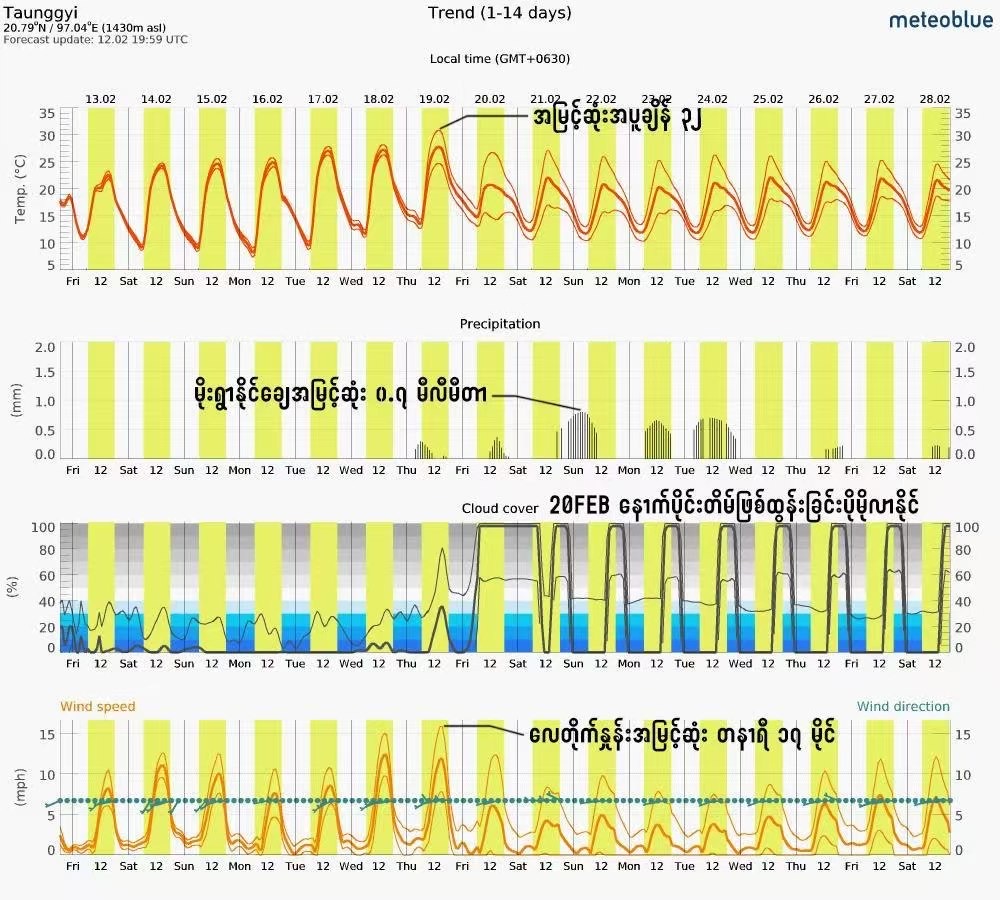根据气象专家吴温乃(U Win Naing)的预测,本周掸邦全境降雨概率较低,南部和东部地区可能出现多云天气。大其力(Tachileik)和景栋(Kengtung)在2月19日左右可能会有零星小雨,但预计雨量不大。