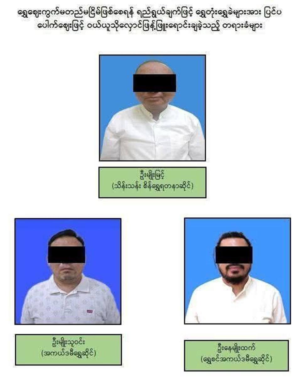 5名燃油和黄金行业商人被政府立案查处。他们涉嫌扰乱市场并蓄意破坏经济。这5人分别是前燃油协会主席吴钦梭。他来自阿佩克斯油气公共有限公司 (Apex Gas and Oli Puplic Co.,Ltd)。前秘书长温敏博士也被起诉。他属于妙密达蒙服务有限公司 (Myat Myitter Mon Service Co.,Ltd)。名单里还有黄金协会主席吴苗敏。他名下有登丹金钻珠宝店 (သိန်းသန်း စိန်ရွှေရတနာဆိုင်)。第一副主席吴苗杜温也被查。他来自阿卡德米金店 (အကယ်ဒမီရွှေဆိုင်)。最后是秘书长吴内苗泰。他属于瑞欣阿卡德米金店 (ရွှေစင်အကယ်ဒမီရွှေဆိုင်)。他们涉嫌违反2012年重要商品和服务法第5条。同时他们还触犯了刑法第109条。目前这些被捕商人无法获得保释。相关部门正在对他们进行审查。随后案件将移交到相关镇区法院审理。
