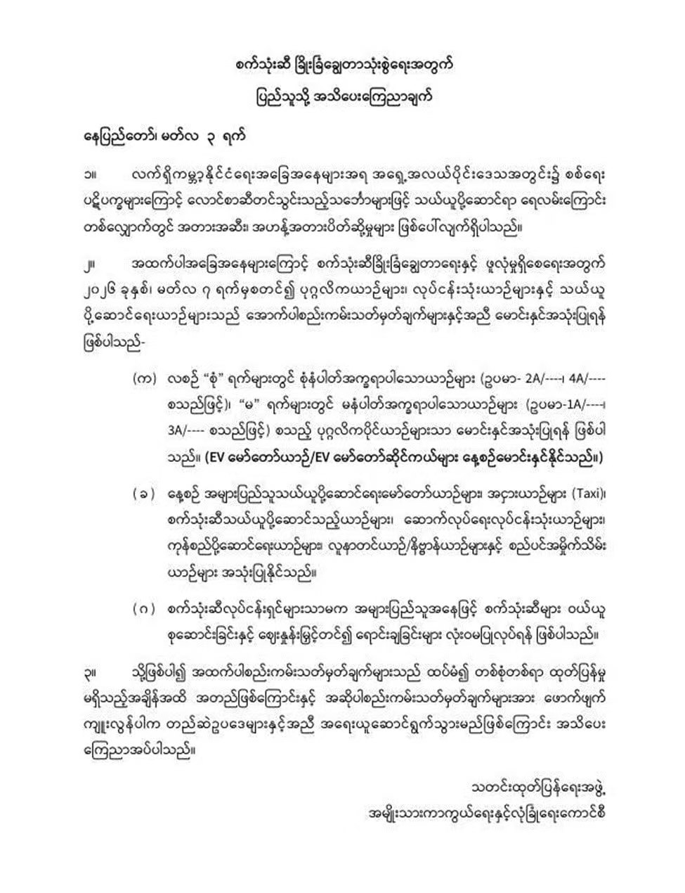 缅甸国防与安全委员会3月3日发布了新规定,为了应对全球政治局势并节约燃油。私家车从2026年3月7日开始实行单双号限行。“双数日期”只允许双号车牌上路,比如车牌带有2A或者4A的车辆。“单数日期”只允许单号车牌上路,比如车牌带有1A或者3A的车辆。部分车辆不受这个规定的限制,包括电动汽车和电动摩托车。出租车和救护车也可以正常行驶,运油车和垃圾清运车不受影响,殡仪车辆同样不在限行范围内。官方严禁任何人私自囤积燃油,也绝对不允许加价倒卖燃油。这项命令将一直有效直到官方发布新通知。
