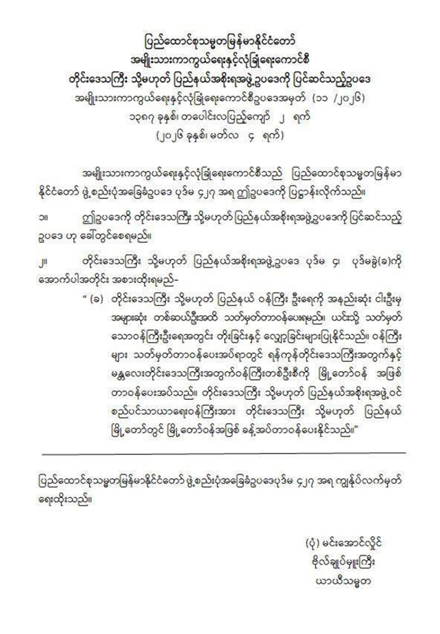 缅甸正式修改了省邦政府法。新法律专门增加了一项新规定。各省邦的市政部长可以直接被任命为市长。缅甸国防和安全委员会在3月4日通过了这项修正案。这也就是第11/2026号法律。