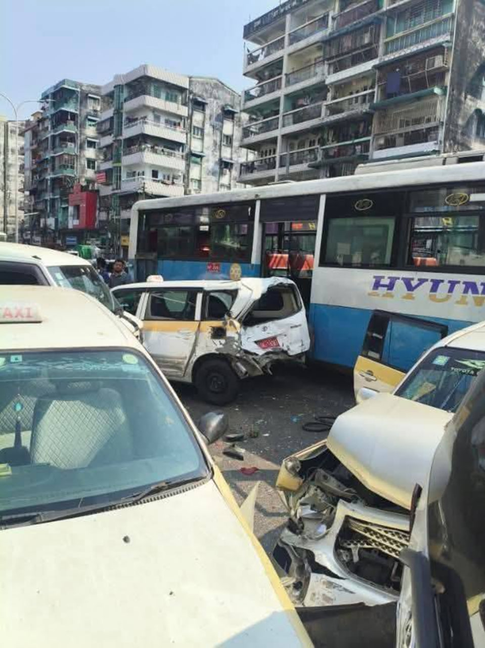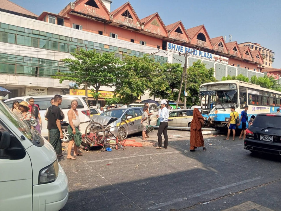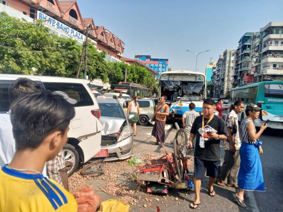 3月5日下午2点多,仰光达梅镇区发生一起连环车祸。在塔曼巴扬路(သဗိန်ဗရမ်းလမ်း)的达梅清真寺公交站附近,一辆YBS公交车突然刹车失灵,导致13辆车追尾相撞。仰光省社会救援组织YRO接报后,立刻赶往现场展开救援。