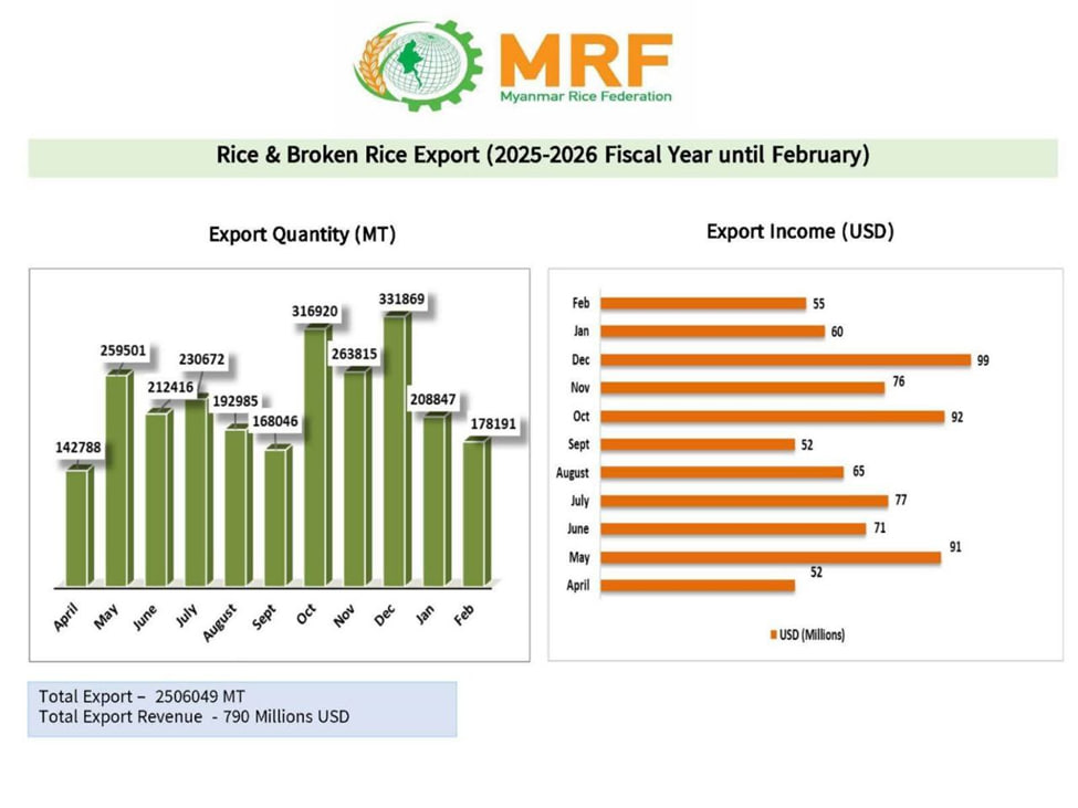 缅甸稻米联合会公布了一组最新数据。在2025到2026财年,也就是从4月到2月这11个月里,缅甸向海外卖出了2506000吨大米和碎米。这些出口一共带来了790000000美元的外汇收入。来看看每个月的具体情况。4月份出口了142788吨,赚回5200000美元。5月份出口量增加到259501吨,收入9000000美元。6月份出口了212416吨,赚到7100000美元。7月份出口了230672吨,收入7700000美元。8月份出口量回落到192985吨,进账6500000美元。到了9月份,一共出口168046吨,赚回5200000美元。