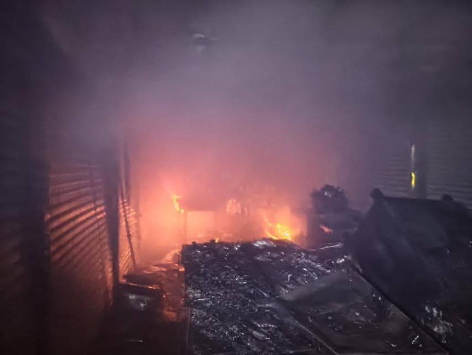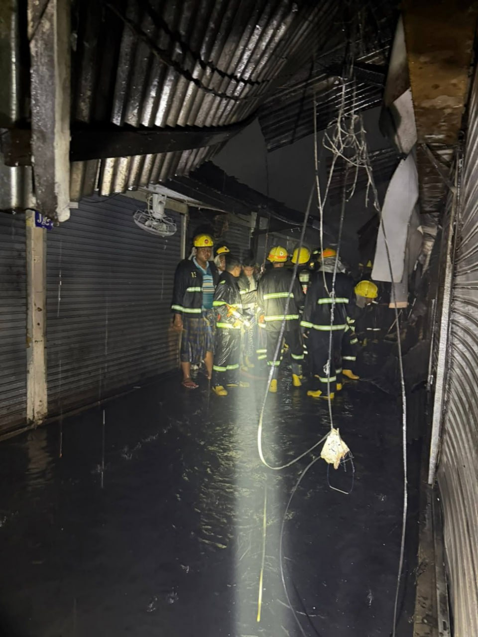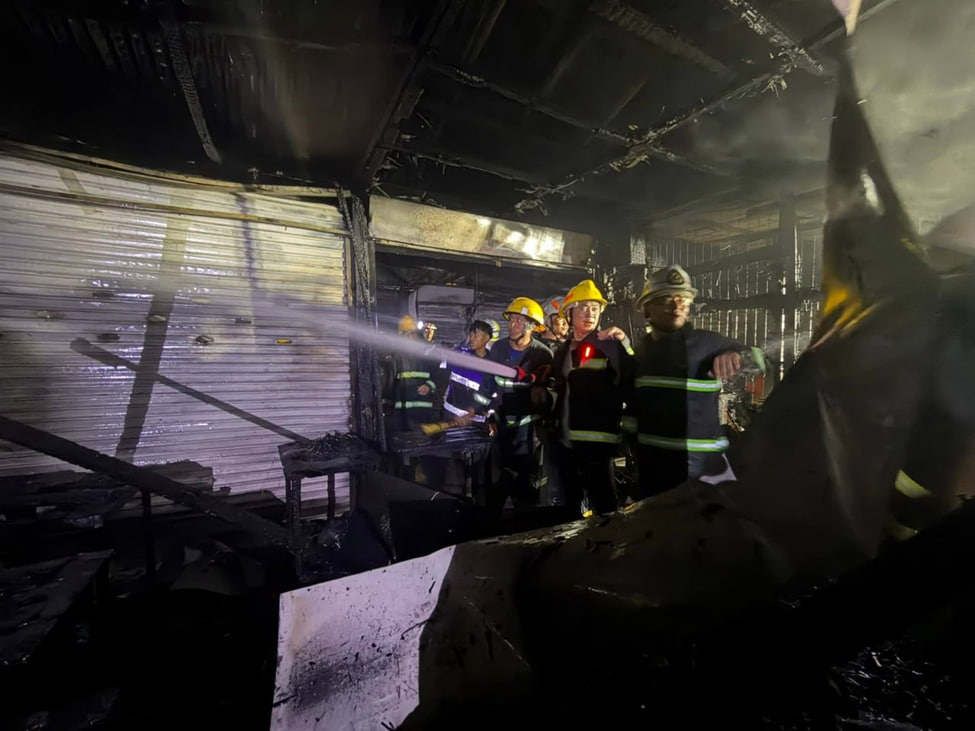 正文:2026年3月10日傍晚6点30分左右,曼德勒玉石交易中心突发大火。起火地点在玛哈昂梅镇区德温东街区(ဒေးဝန်းအရှေ့ရပ်ကွက်),位于38条街与39条街、86条街与87条街之间。多支队伍赶到现场联合扑救。火势在晚上6点45分左右被成功控制,6点52分被彻底扑灭。缅甸消防部门确认,大火一共烧毁了15间单层商铺。这些商铺面积为8乘10英尺,都是铁架结构,配有铁皮屋顶、折叠铁门和水泥地面。