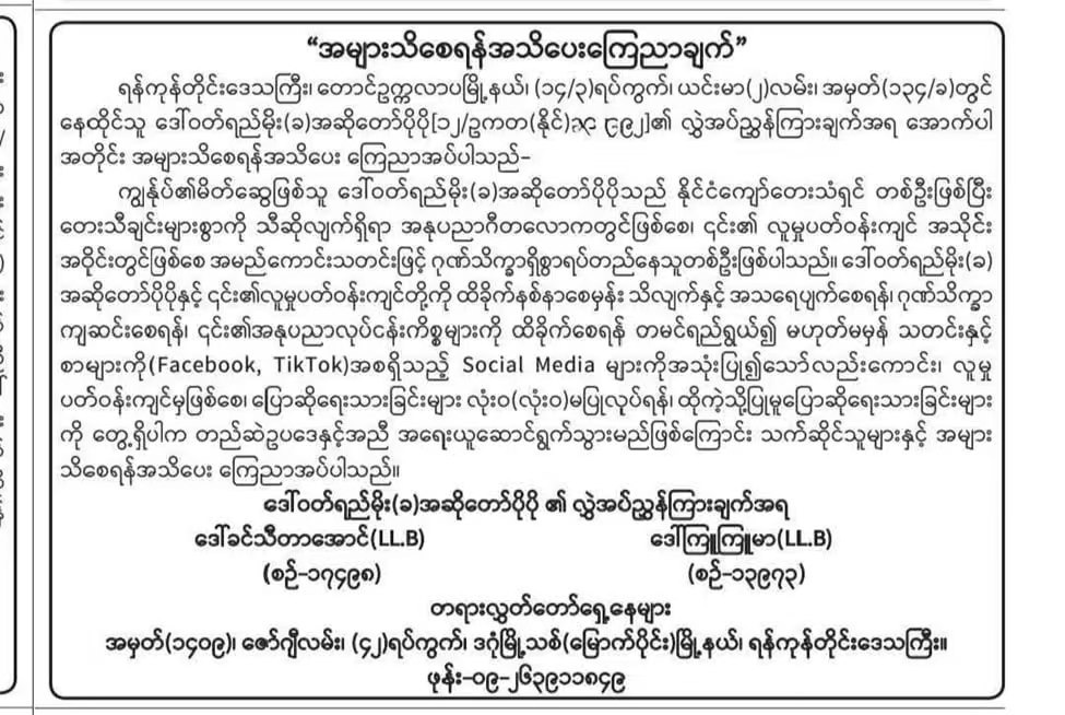 缅甸女歌手波波通过官方报纸发布了一份声明,她表示有人在社交平台上故意捏造虚假信息,企图用这种行为破坏她的演艺事业和个人名誉。对于这类抹黑造谣行为,表示一定会果断起诉维权。这份声明是由她的代理律师代为发布的。