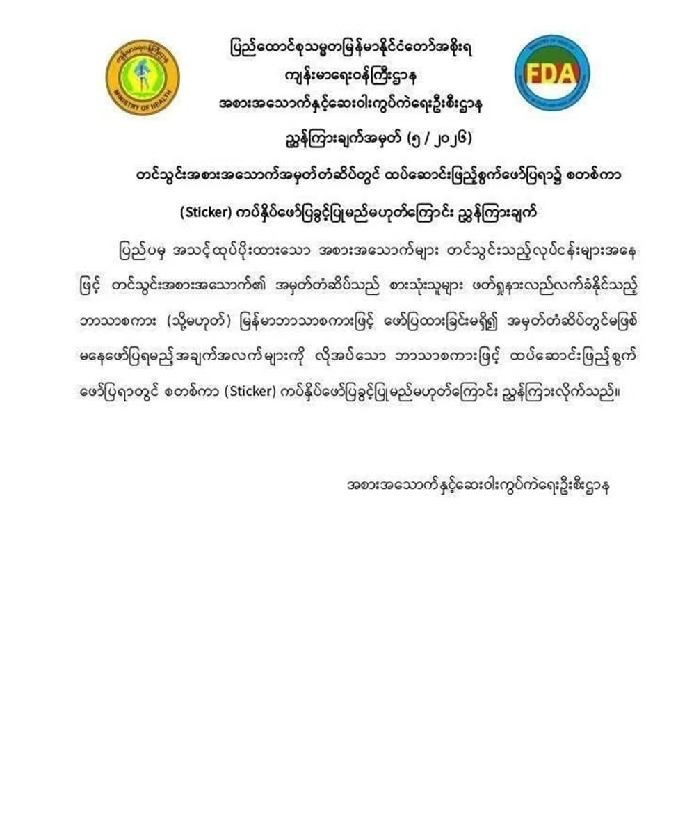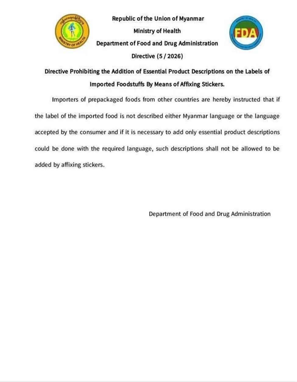 于3月12日,缅甸卫生部食品药品监督管理局发布了一项新规。这项规定专门针对进口预包装食品的企业,以后给进口类食品补充标签信息时绝对不能再用贴纸。很多进口食品原来的包装上没有缅甸文,消费者根本看不懂上面的内容,按照要求商家必须用大家能懂的语言补充强制性信息。因为缅甸食药监局在最新指令中明确强调,严禁商家直接用贴纸把补充信息贴在原包装上。