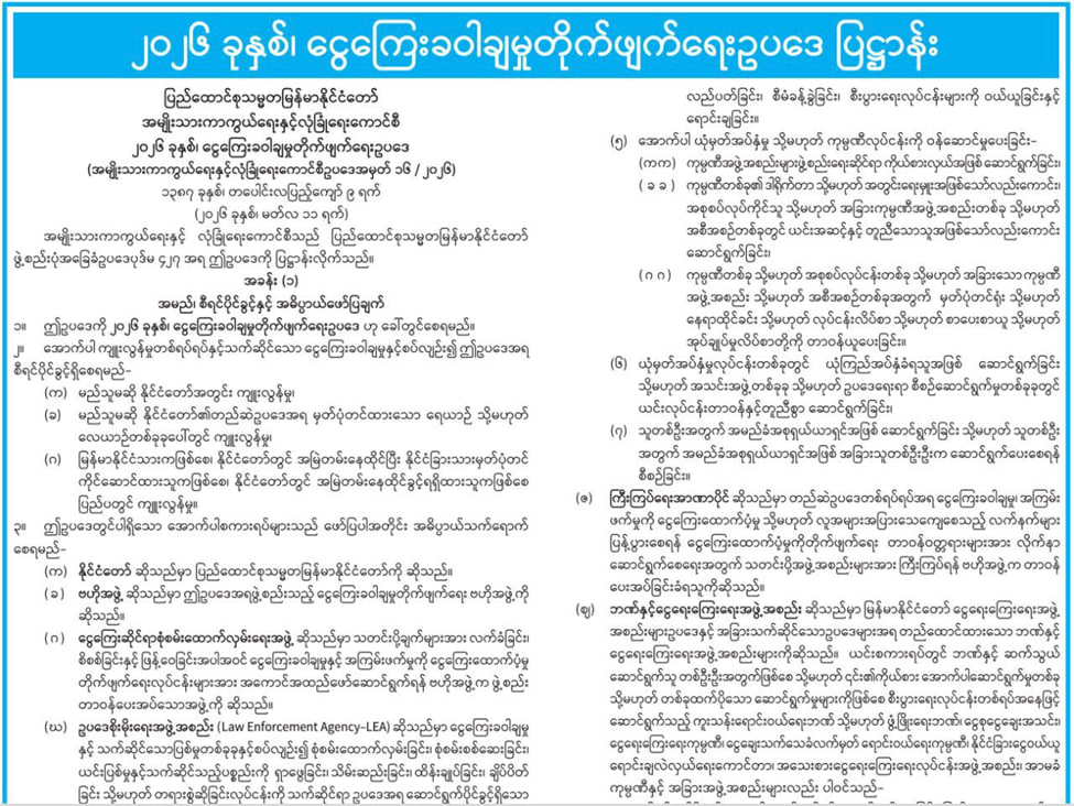 缅甸国防与安全委员会发布了一部新法律。也就是2026年《反洗钱法》。这部法律在2026年3月11号正式出台。对应的编号是国防与安全委员会第16/2026号。委员会是根据《缅甸联邦共和国宪法》的规定。具体依据的是宪法第427条。专门制定并颁布了这项反洗钱法案。