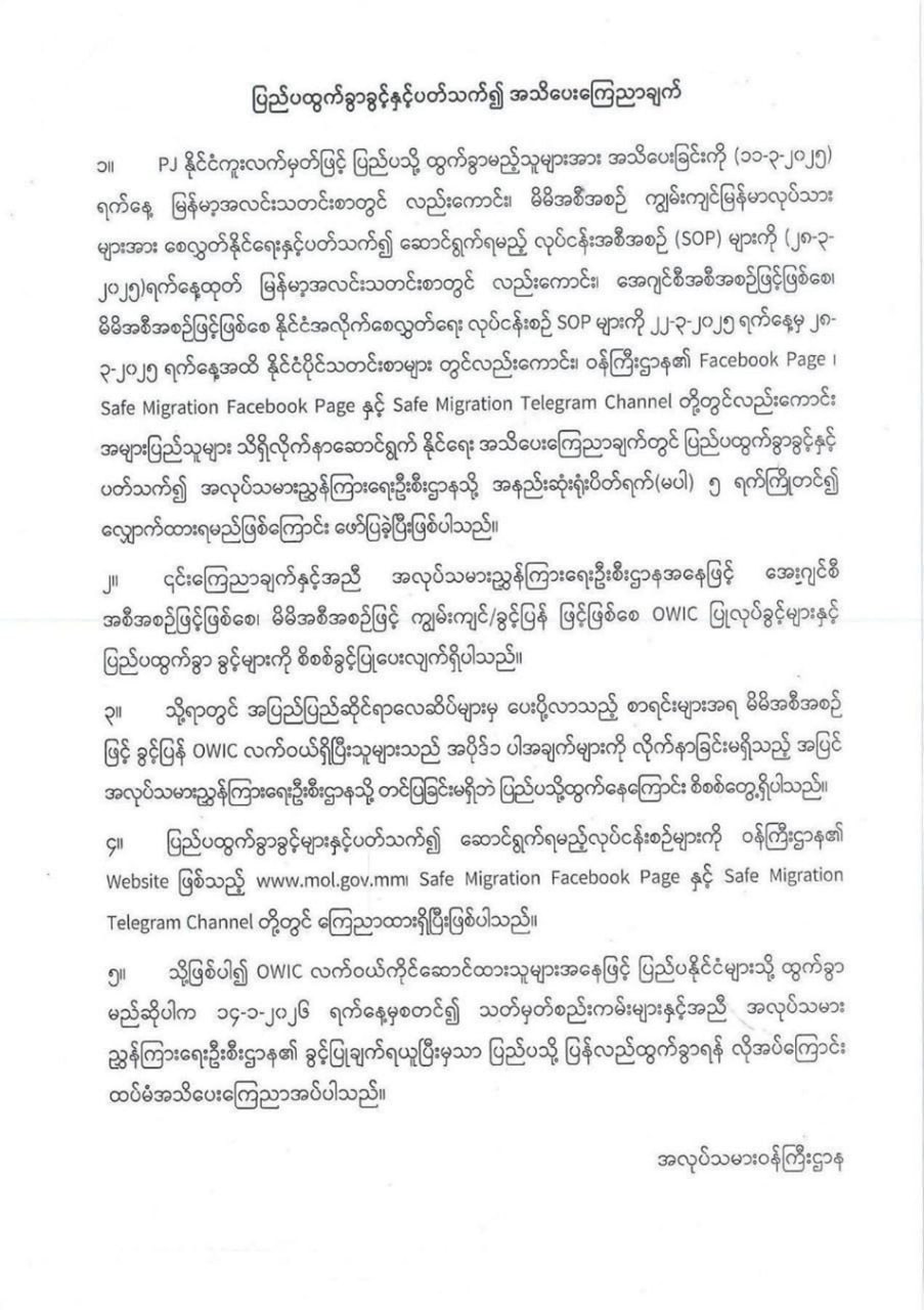 缅甸劳工部再次提醒:持卡劳工出国需提前申请出境许可