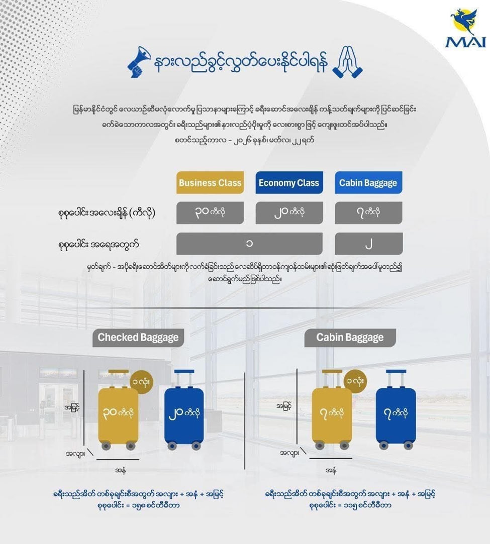 为了保证国际航班能正常飞,缅航国际(MAI)宣布必须下调行李额度。现在经济舱限重20公斤一件,商务舱30公斤一件,手提行李最多两件共7公斤,超重行李最多只能带5公斤。航空公司还提醒,根据飞行需要,机场可能会拒收或无法装载部分行李。如果行李没能同机抵达,公司保证会在72小时内把行李送到主人手里。