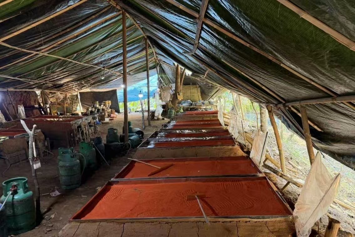 3月24日下午3点左右,缅甸军方查获一个大型制毒工场,工场位于大其力镇区孟海(下)(မိုင်းဟဲ (အောက်))村组的考亚(ကော့ရား)村附近,现场缴获的毒品及设备价值高达202亿缅币。搜查人员共发现11个帐篷,其中2个大帐篷专门用来制毒和包装。其他帐篷则用作宿舍和食堂。现场一共搜出690万粒WY麻古和49公斤冰毒。此外还有大量毒品粉末和碎渣,制毒设备包括4台压片机和1台搅拌机。旁边还有32个煤气罐和1台大型发电机。现场还囤积了110多袋咖啡因等化学原料,工场里甚至配有1台第3代星链上网设备。目前查获的物品正移交给相关部门,周边可能还有其他制毒点,清剿行动还会继续。虽然端掉了这个大型工场,但现场连一个人都没抓到。