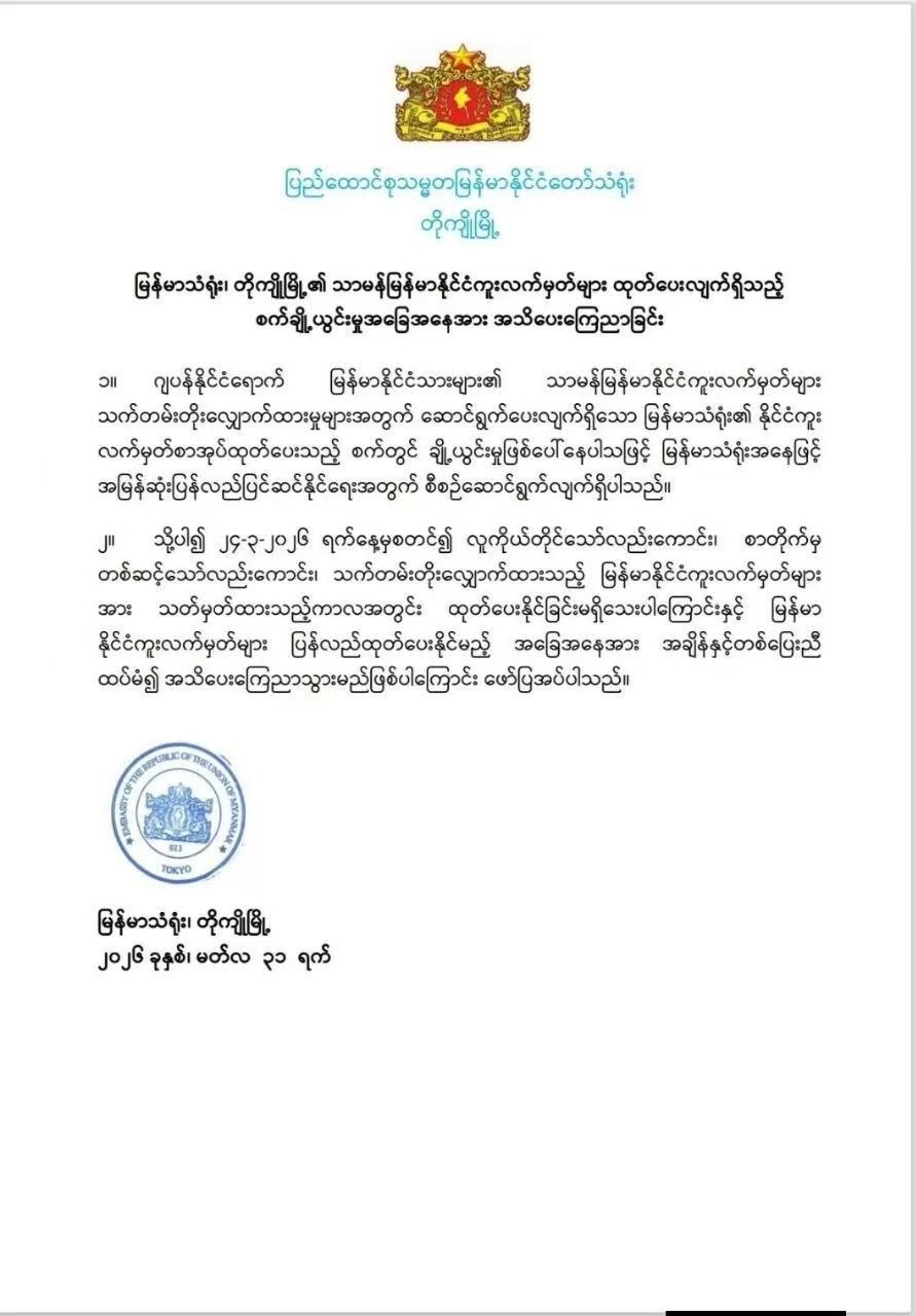 缅甸驻日本东京的大使馆近期制证机器坏了,受此影响,从3月24日起,不管是现场办理还是邮寄办理的护照延期申请,都没办法按期拿到新证,目前使馆正在加紧抢修故障机器。至于什么时候能恢复正常发证,使馆表示会另行通知。