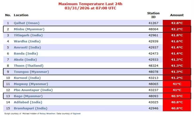气象网站eldorado weather更新了数据,缅甸有4座城市进入全球最热15座城市名单,敏巫的气温高达42.2摄氏度,排名世界第2。东吁气温41.3摄氏度,排第9,马圭气温41摄氏度,排第11,勃固气温40.9摄氏度,排第13。在这份榜单里,排在第一的是阿曼的库韦哈特(ကွယ်ဟတ်မြို့),其余上榜城市主要在泰国和印度。