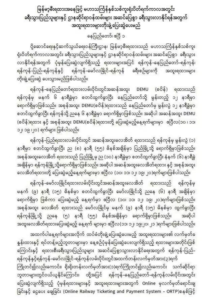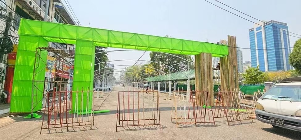 仰光省将在多地举办步行泼水节,具体地点包括皎德达镇区的玛哈班杜拉公园路(မဟာဗန္ဓုလပန်းခြံလမ်း),达贡镇区的人民广场(ပြည်သူ့ရင်ပြင်)也会设立活动点。乌维扎亚环岛(ဦးဝိစာရအဝိုင်း)到阿隆路(အလုံလမ်း)沿线同样会举办。全省各县和镇区都将同步开展步行泼水节,市政厅门前目前正在搭建中央舞台。节日期间,这里每天早晚都会有国家级艺术家登台表演,现场还会举办传统群舞比赛,并向大众免费分发餐饮。参加群舞比赛的队伍涵盖幼儿园、学校及各大机构。另外还设有公开组、男子公开组和少数民族传统舞蹈项目。