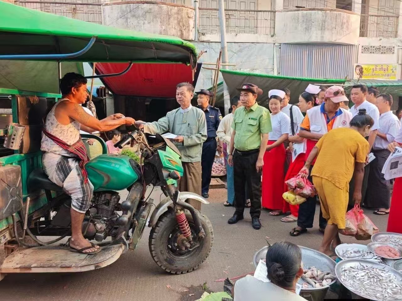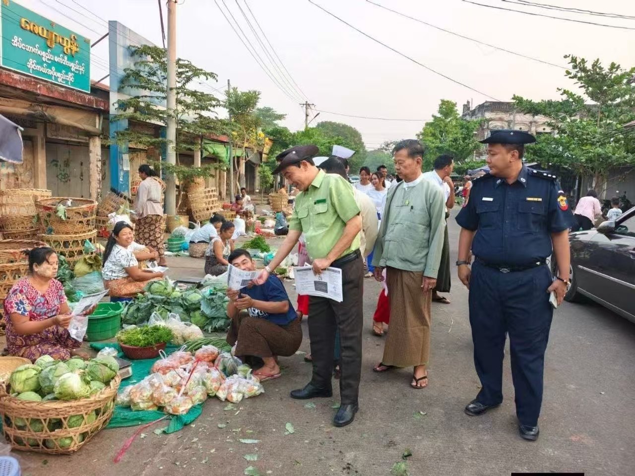 这几天当地气温不断升高,马圭省昂兰镇区在4月3日专门开展了防暑宣传活动,活动地点在刚基街区(ကန်ကြီးရပ်ကွက်)的中心市场。工作人员向市场内外的商贩和顾客免费发放宣传册,这些防暑知识手册由公共卫生局统一印发,昂兰镇区医院院长也在现场普及健康知识。他向大家详细讲解了高温可能引发的疾病,他还特别提醒了居民防暑的日常注意事项和禁忌。