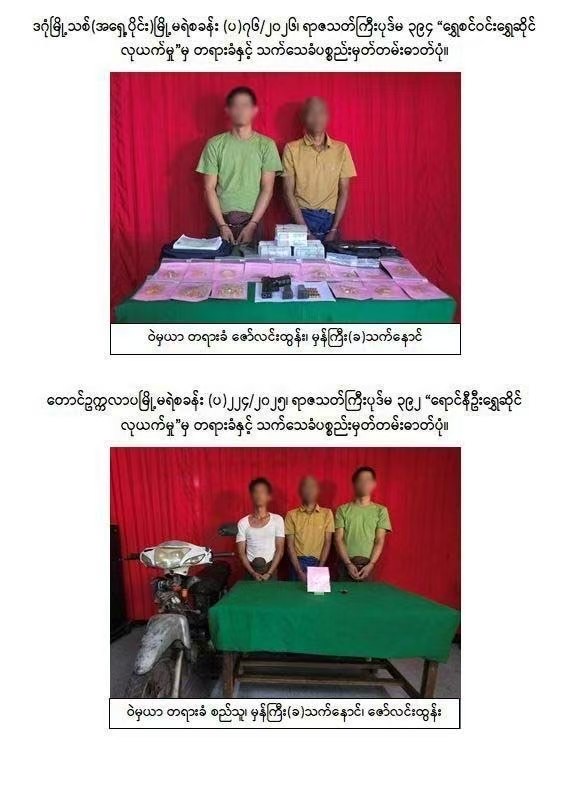 3月28日傍晚,仰光省东达贡新城镇区8号街区发生持枪抢劫案,瑞辛温(ရွှေစင်ဝင်း)金店老板和员工带着黄金等车回家,这批黄金总价值约8.5亿缅币。2名男子突然冲出来鸣枪威胁,嫌疑人用拆车轮的扳手殴打受害者,他们抢走黄金后,乘坐第3名同伙的摩托车逃跑。当地警察局迅速根据刑法第394条立案调查,4月1日和2日,警方先后抓获3名嫌疑人。他们分别是33岁的佐林吞、58岁的德瑙和38岁的西都。警方当场查获被抢的黄金和作案枪支弹药,审讯查明,这3人还干过另外1起金店抢劫案,他们曾抢劫南奥卡拉帕镇区6号街区的1家金店,被抢金店名叫扬尼乌(ရောင်နီဦး),开在南达温(နန္ဒဝန်)市场旁边。