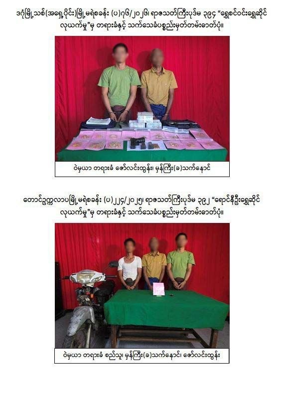 3月28日傍晚,仰光省东达贡新城镇区8号街区发生持枪抢劫案。瑞辛温(ရွှေစင်ဝင်း)金店老板和员工带着黄金等车回家。这批黄金总价值约8.5亿缅币。2名男子突然冲出来鸣枪威胁。嫌疑人用拆车轮的扳手殴打受害者。他们抢走黄金后,乘坐第3名同伙的摩托车逃跑。当地警察局迅速根据刑法第394条立案调查。4月1日和2日,警方先后抓获3名嫌疑人。他们分别是33岁的佐林吞、58岁的德瑙和38岁的西都。警方当场查获被抢的黄金和作案枪支弹药。审讯查明,这3人还干过另外1起金店抢劫案。他们曾抢劫南奥卡拉帕镇区6号街区的1家金店。被抢金店名叫扬尼乌(ရောင်နီဦး),开在南达温(နန္ဒဝန်)市场旁边。