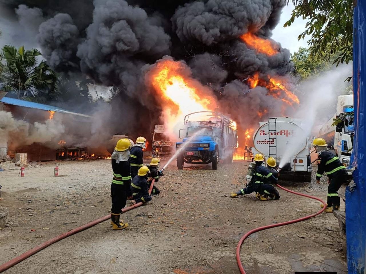 克钦邦密支那镇区一家油库发生火灾。具体位置在瑞瑟(ရွှေစက်)街区1号区的嘎仁诺(ကရိန်နော်)市场附近。事发后密支那镇区消防局的消防员马上赶到现场。志愿消防员和社会救援组织也一起加入了灭火行动。经过大约1个小时的紧急扑救。早上9点35分大火终于被扑灭。现在消防部门的负责人正在调查起火原因。具体的财产损失也还在进一步核实当中。