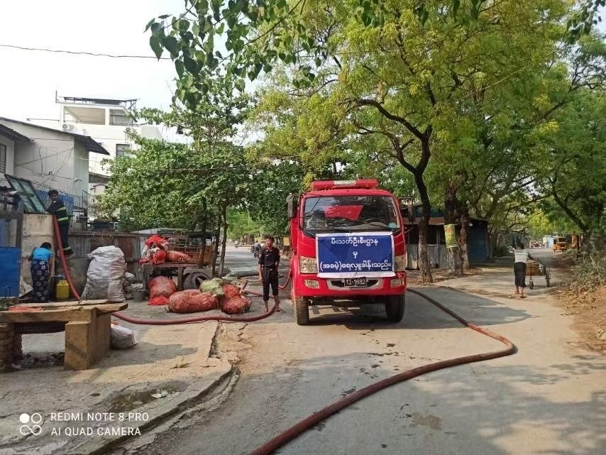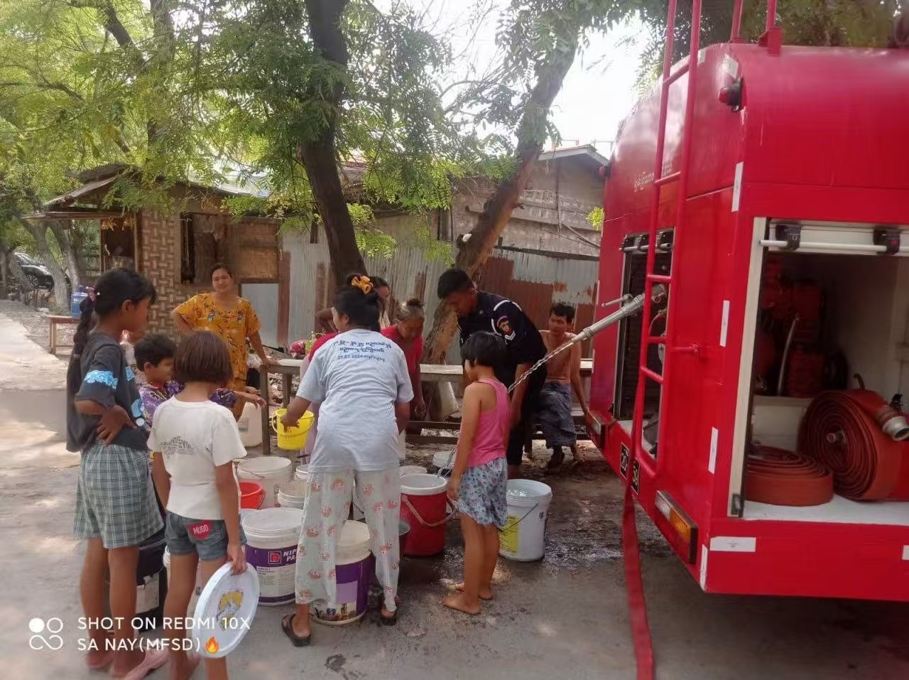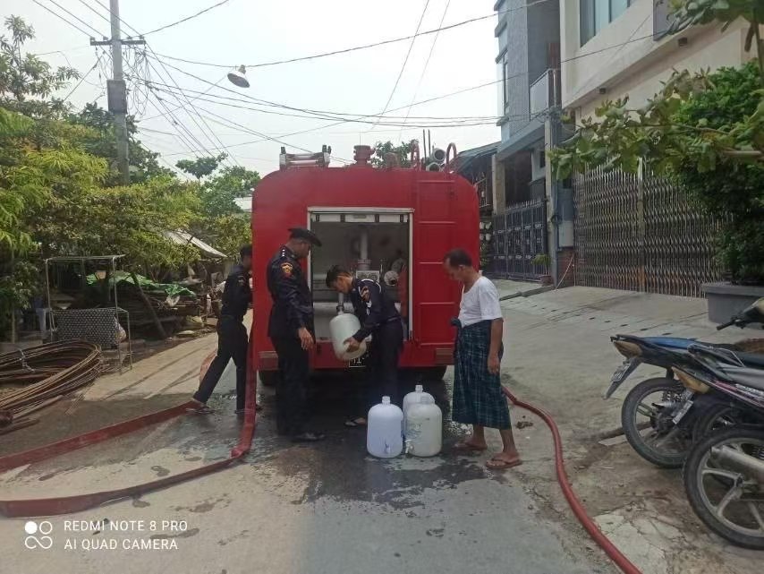 4月7号中午12点左右,曼德勒省昌妙达齐镇区部分家庭缺水,具体位置在53条路、106街和107街之间,这里属于昂彬列(အောင်ပင်လယ်)街区。昌妙达齐镇区消防局立刻出动1辆运水车,昂彬列地区消防局也出动1辆消防车。另外昂彬列迪素(အောင်ပင်လယ်တစ်စု)志愿消防局派出了1辆运水车,多名正规消防员和志愿消防员一起合作,他们顺利为当地居民送去了急需的饮用水。