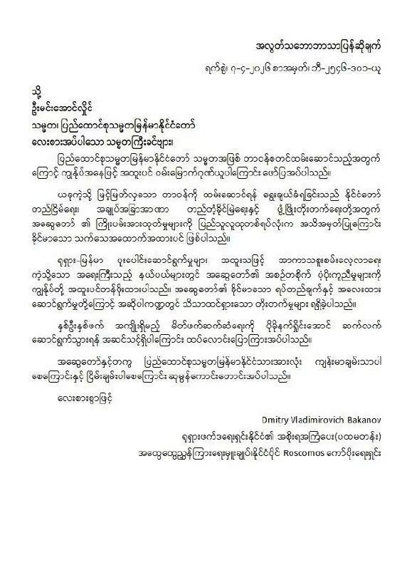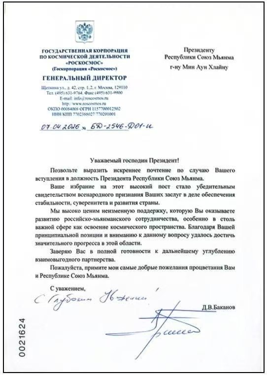 敏昂莱大将当选国家总统,俄罗斯政府一级顾问兼国家航天集团总裁巴卡诺夫向他发来贺电。贺电里写道,这充分证明了一件事,那就是全国人民都很认可敏昂莱大将的努力,贺电还提到俄罗斯和缅甸的双边合作,特别是双方非常重视太空探索等重要领域。所以现在这些板块有了明显的进步,巴卡诺夫在贺电最后表示,俄罗斯已经准备好继续加深两国的伙伴关系,让双方都能从中受益。