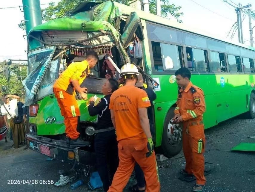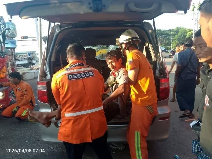 今天4月8号早上6点37分左右,仰光省明加拉洞镇区3号公路的3号红绿灯路口发生车祸,有人被困在车里。明加拉洞消防局马上出动1辆消防车和多名消防员赶到现场救援,这起车祸导致1名男司机受伤,好在没有生命危险。随后,杰辛梅达(ကြယ်စင်မေတ္တာ)慈善协会的救护车把他送到了北奥卡拉帕镇区人民医院治疗。