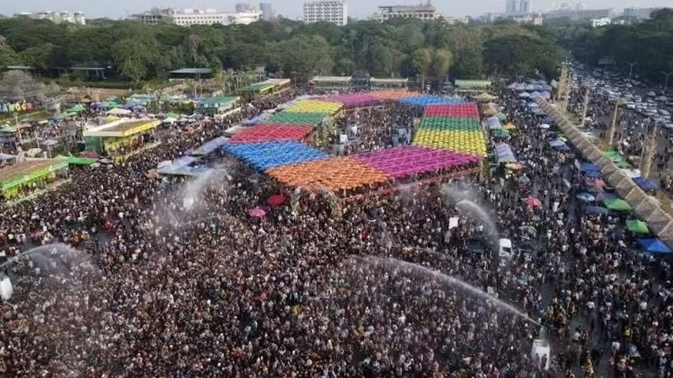 2026年4月16日傍晚是缅甸泼水节的最后一天,仰光人民广场的泼水节活动现场人山人海,前来玩水和看演出的民众把广场变成了人的海洋。因为是节日的最后一天,大家的热情格外高涨,仰光市的各个泼水台和步行街都挤满了人。人民广场的演出现场也被围得水泄不通,到处都是和家人朋友一起开心过节的人群。