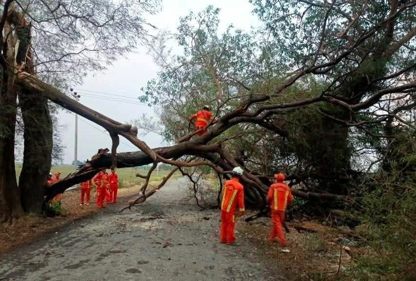 4月19日下午5点左右,马圭省崩漂镇区(ပွင့်ဖြူမြို့နယ်)遭遇强风天气。狂风把许多树木吹倒在马路上,导致交通大面积拥堵。事情发生后,当地多个部门迅速出动联合清理。行政人员、警察、消防员和公路局员工第一时间赶到现场。市政人员、安保部队和附近村民也一起帮忙,大家齐心协力清除了路面的树木。