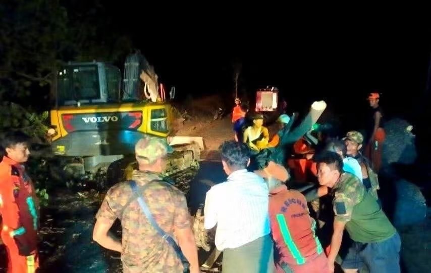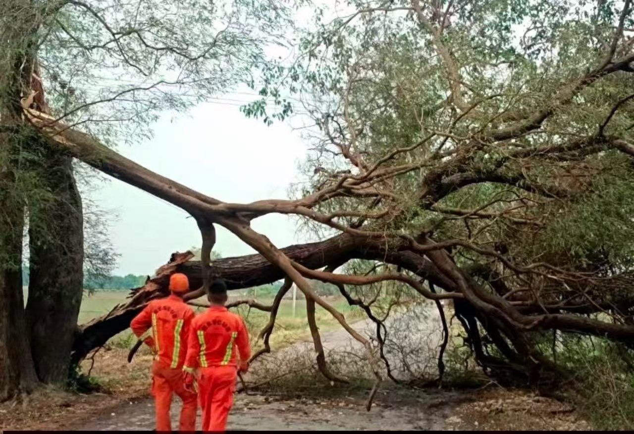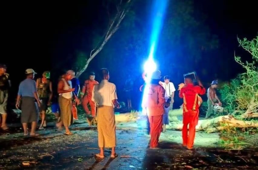 4月19日下午5点左右,马圭省崩漂镇区(ပွင့်ဖြူမြို့နယ်)遭遇强风天气,狂风把许多树木吹倒在马路上,导致交通大面积拥堵。事情发生后,当地多个部门迅速出动联合清理。行政人员、警察、消防员和公路局员工第一时间赶到现场,市政人员、安保部队和附近村民也一起帮忙,大家齐心协力清除了路面的树木。
