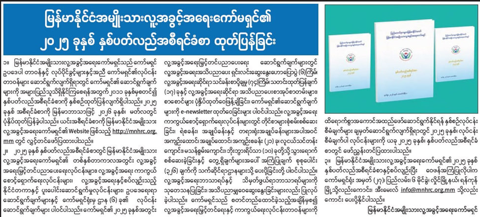 缅甸国家人权委员会公布了年度报告。2025年,他们一共向相关部门提出了326条建议。为了保护人权,委员会认真调查了收到的投诉信。他们实地走访了警察局和法院的拘留所,还视察了21个监狱、看守所和劳改营,以及10所青少年培训学校、残疾人学校和养老院。根据实际看到的情况,委员会整理出了这326条建议并交给了相关部门。